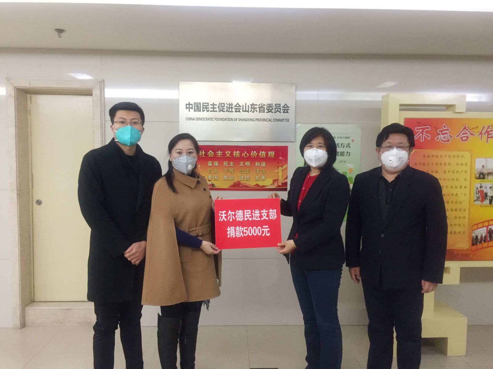 2月4日,沃爾德集團民進支部副主委、金諾國拍副董事長胡懷英,民進會員、金諾國拍總經理助理主金坤前往中國民主促進會山東省委員會,代表沃爾德集團及集團民進支部捐贈愛心款5000元,用于支持山東民進抗擊疫情第一線。