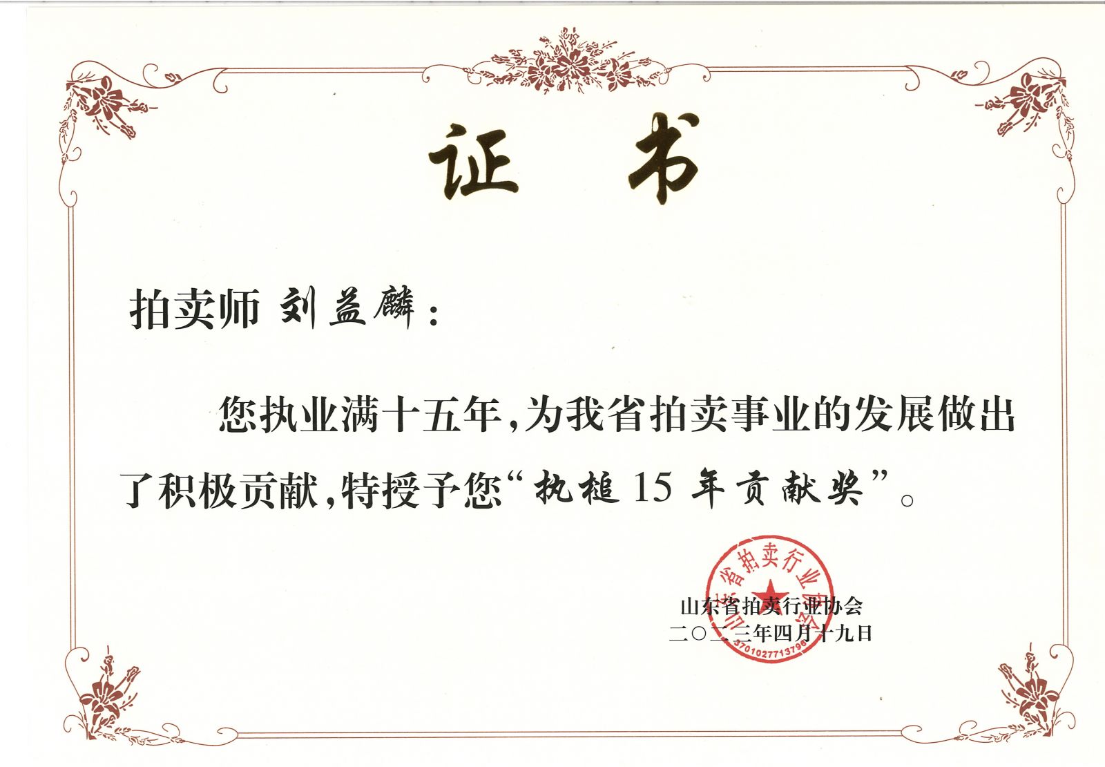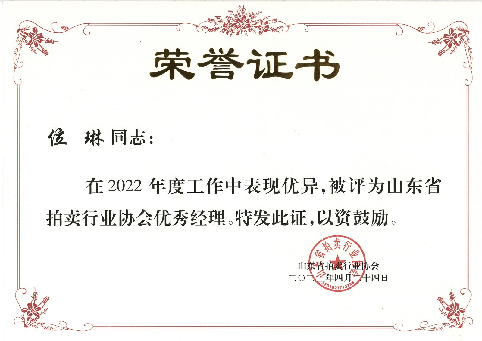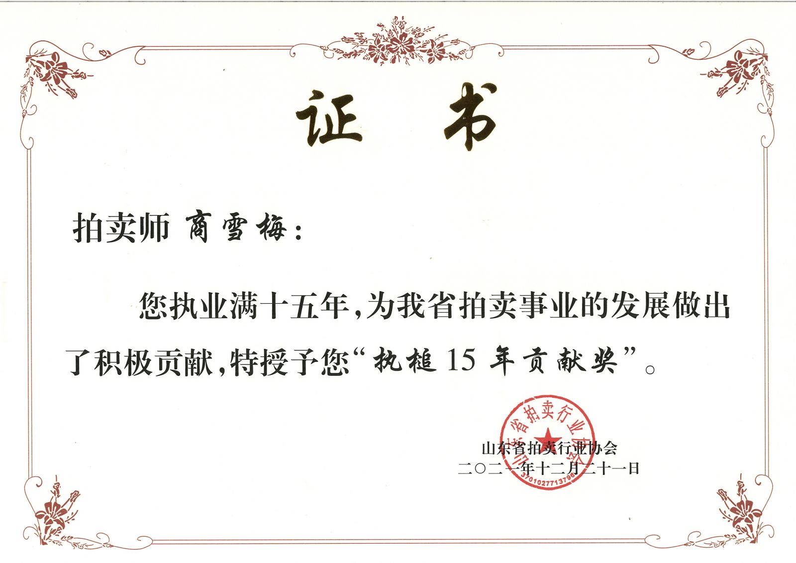 為表彰先進(jìn),樹立典范,進(jìn)一步擴(kuò)大拍賣行業(yè)影響力。近日,山東省拍賣行業(yè)協(xié)會向獲得省拍協(xié)2022年度先進(jìn)單位和優(yōu)秀經(jīng)理及榮獲山東省“執(zhí)槌15年貢獻(xiàn)獎(jiǎng)”的拍賣師頒發(fā)榮譽(yù)證書。
