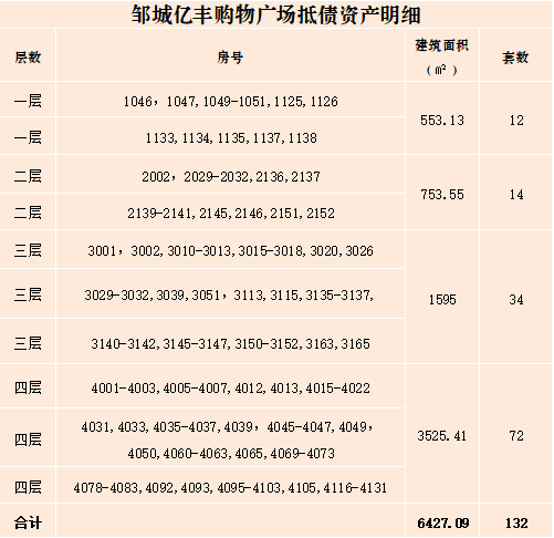 基本情況:該抵債資產(chǎn)位于鄒城市平陽西路499號(hào)。總建筑面積6427.09㎡,房間132套,包括一層12套,二層14套,三層34套,四層72套,經(jīng)法院裁定抵債,未辦理過戶手續(xù)。